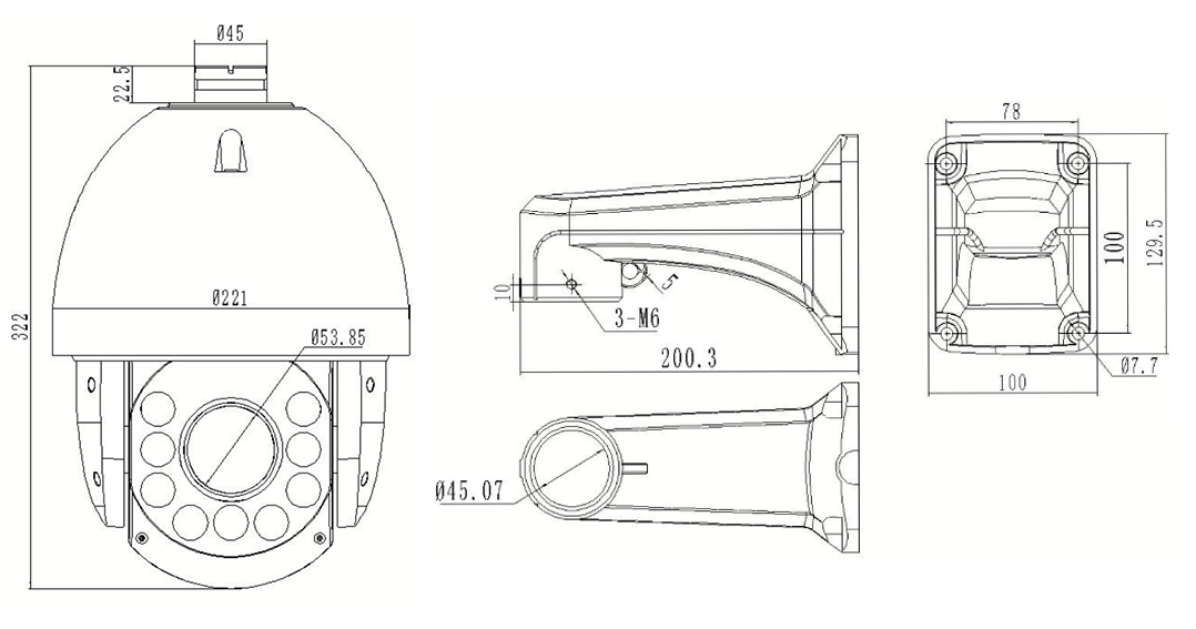 ഞങ്ങളുടെ PTZ ക്യാമറ 6 കിലോ ഭാരം, φ221 മിമി × 322 എംഎം അളവുകൾ ഉപയോഗിച്ച് രൂപകൽപ്പന ചെയ്തിരിക്കുന്നു.